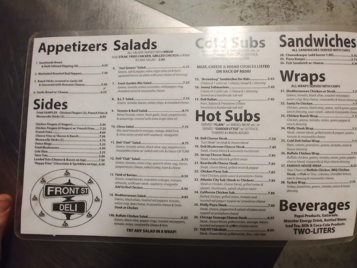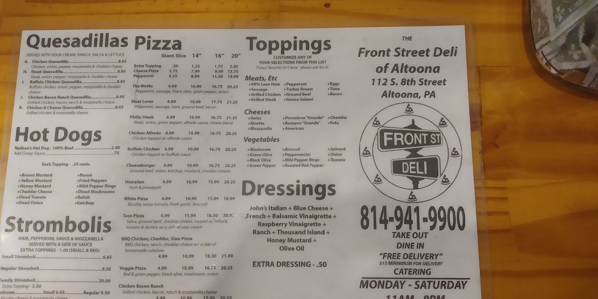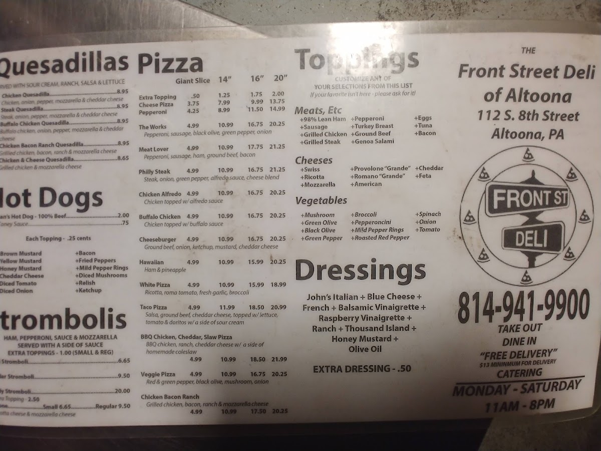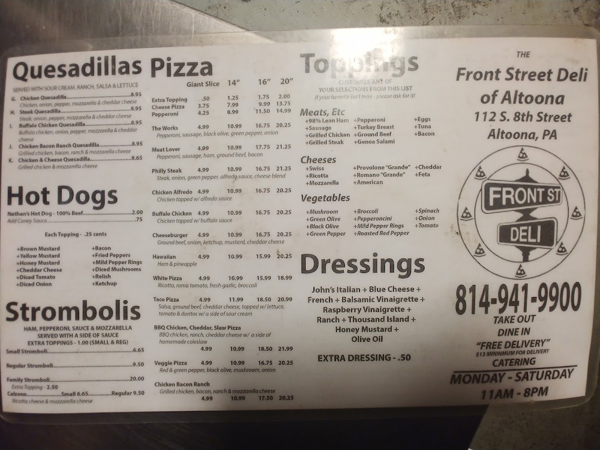If you're in Altoona, PA, and craving something comforting and delicious, look no further than Front Street Deli Menu. Located at 112 S 8th St, this cozy spot is known for its mouthwatering selection of sandwiches, hearty soups, and classic deli favorites that hit the spot every time. Whether you're looking for a quick bite during lunch or a relaxed meal with friends, the menu offers something for everyone. From piled-high pastrami on rye to fresh salads and a variety of delicious sides, there’s no shortage of options to satisfy your cravings. Don't forget to check out their daily specials-each one is packed with flavor and made fresh to order. You’ll find yourself coming back for more every time!